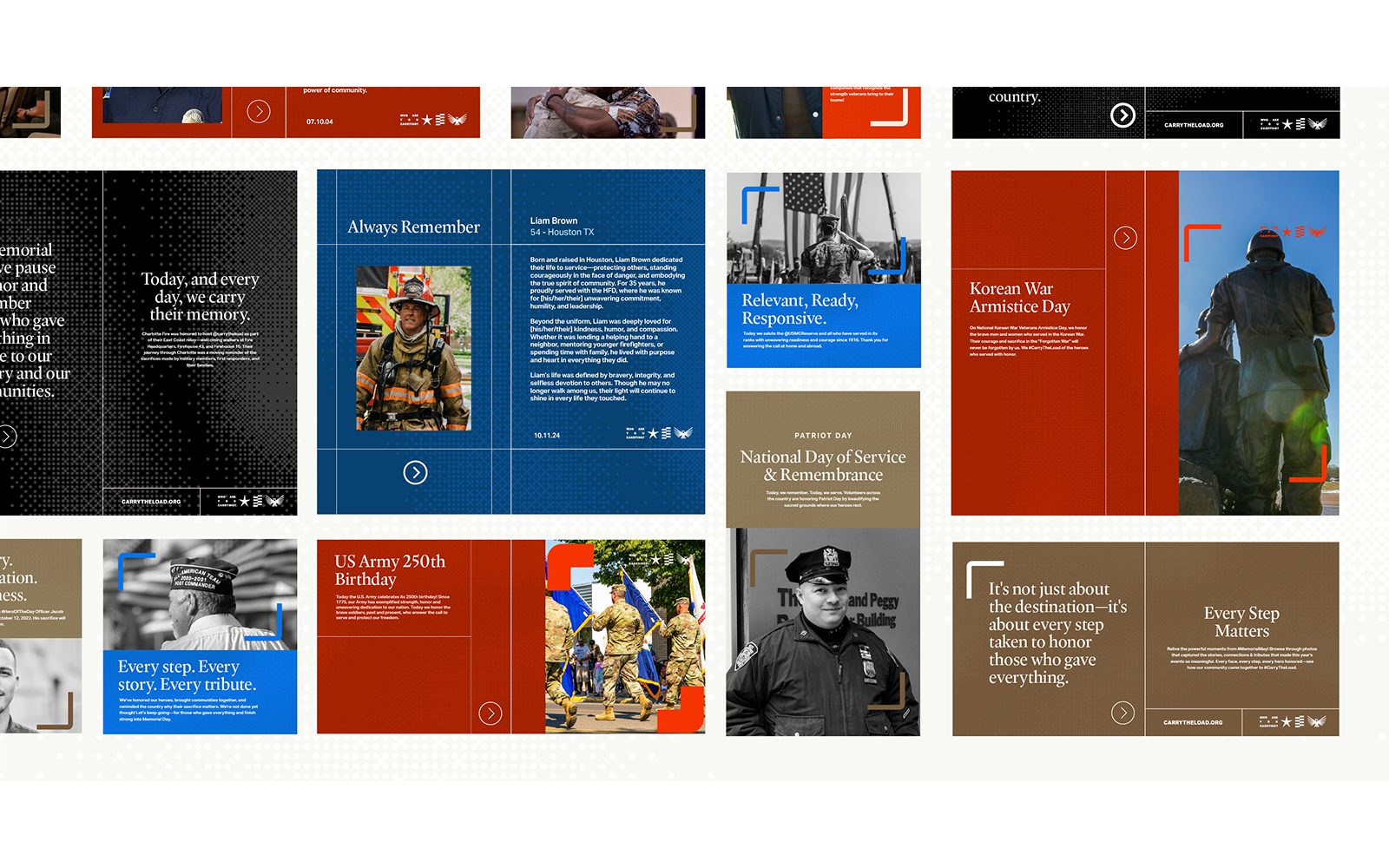 The rebrand translates Carry The Load’s purpose into a cohesive visual and emotional language. The creative direction centers on a modular, layered aesthetic inspired by archival records. Brackets function as a core structural motif—acting as a symbolic container for the stories of first responders and their families. To move away from generic patriotic tropes, the palette was refined using muted red and blue tonalities balanced by a grounded neutral. This system ensures that every touchpoint feels both high-energy and deeply respectful.